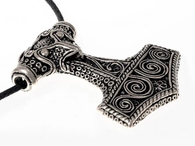 Sehr großer und schwerer Thor's Hammer Anhänger mit Band aus Baumwolle (sieht aus wie ein Lederband 1m). Der nordische Name für den Thorshammer war Mjöllnir, der in etwa Zermalmer, Zerschmetterer oder Blitz bedeutete. Denn mit dem Mjölnir bekämpfte Thor die Feinde der Götter, allen voran die Riesen, und am Ende der Welt im Ragnarök die Midgardschlange.