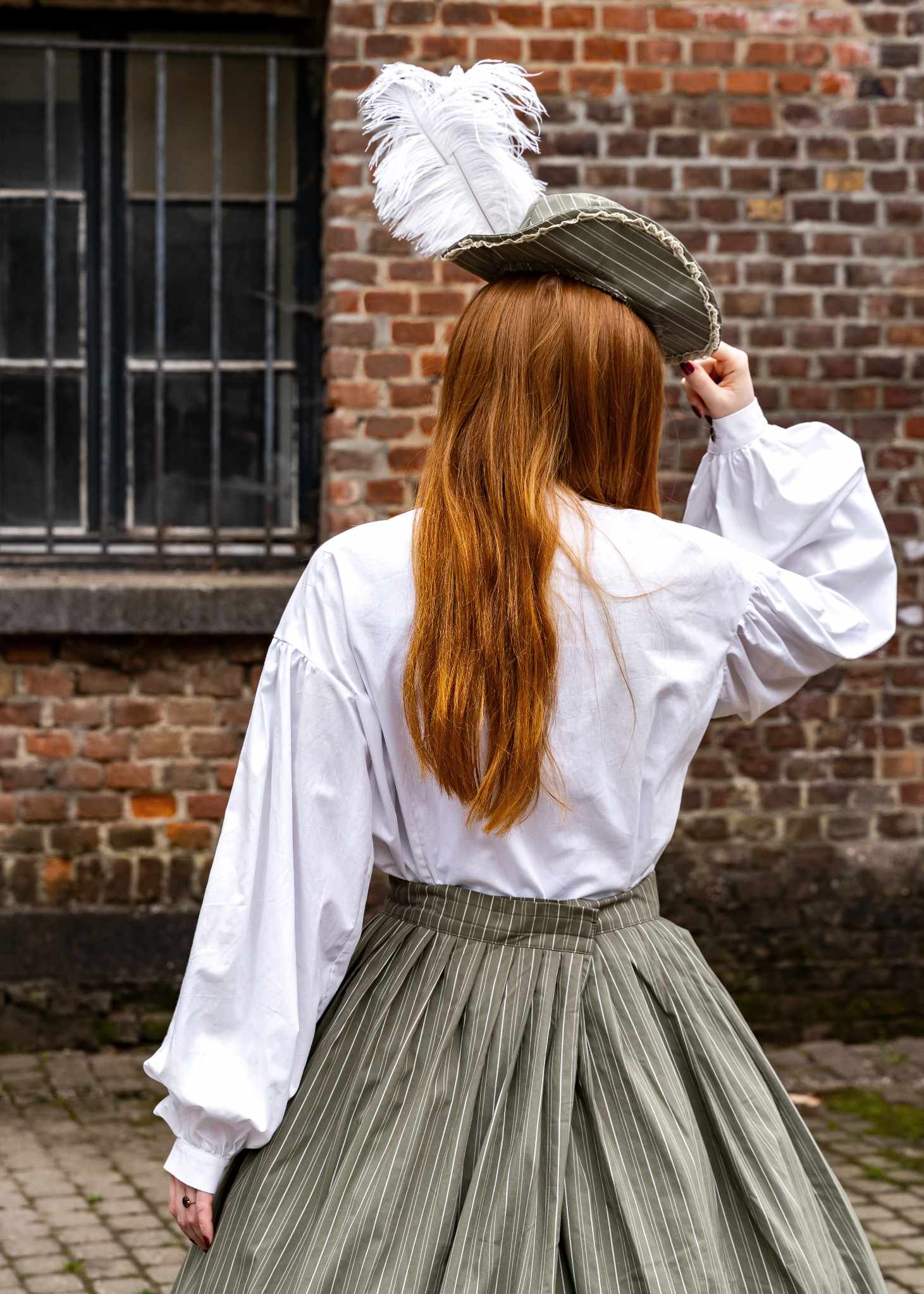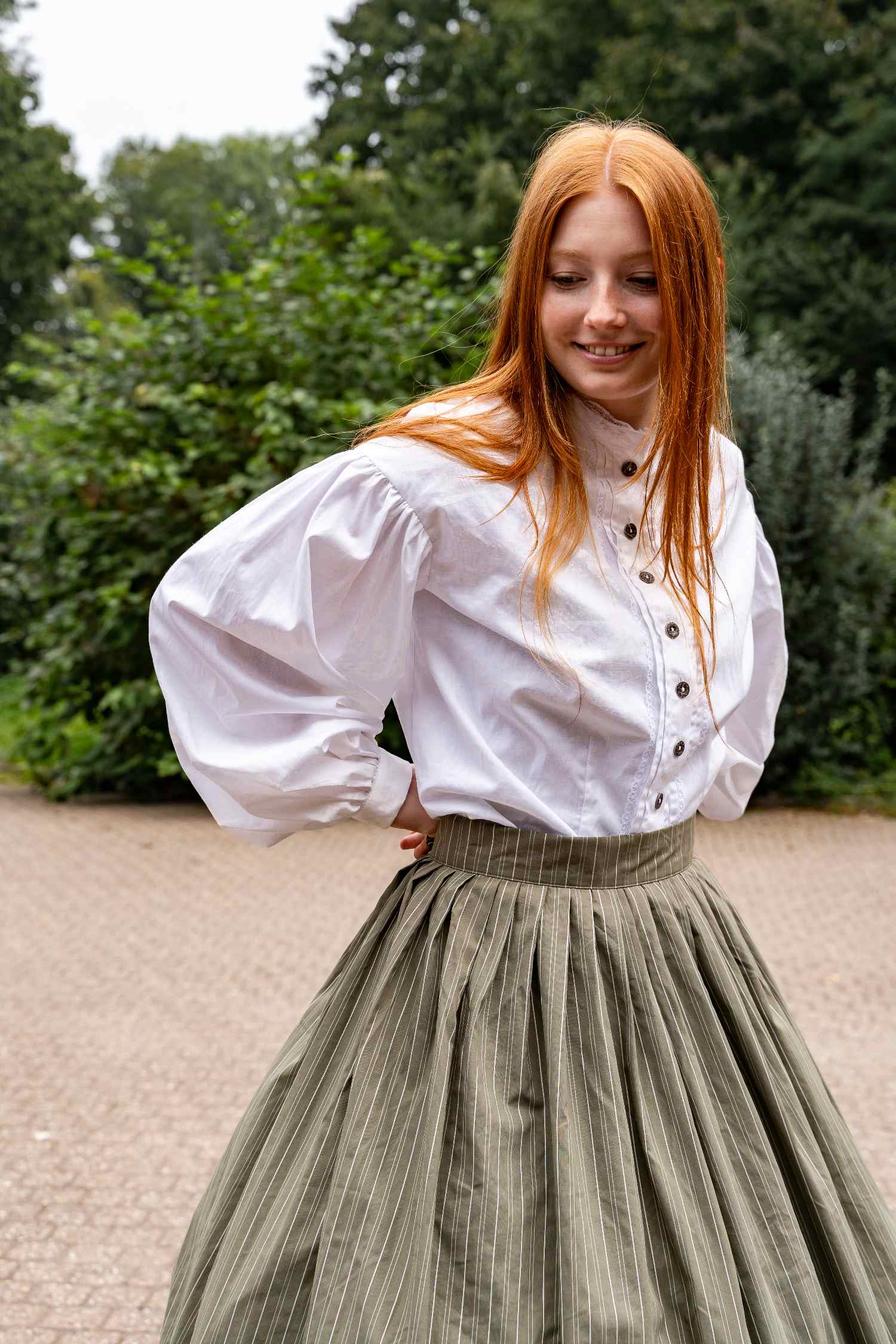 Für jede Theaterbühne oder als Western Outfit, zu Pullmanncity ist sie ein Augenweide. Ihr könnt auch die Charles Dickens Zeit darstellen. Je nach Kopfbedeckung kann diese Bluse sehr bieder oder auch sehr schick wirken:-) Am oberen Kragen ist eine sehr weiche elastische Wäschespitze angebracht, damit es nicht kratzt. Einige Falten in der Mitte geben der Bluse noch etwas mehr Eleganz. Echte Metallknöpfe verzieren die Front uns die Ärmelbündchen. Sie paßt auch hervorragend unter die Bluse Jeannette, wenn ihr sehr schlank seid!