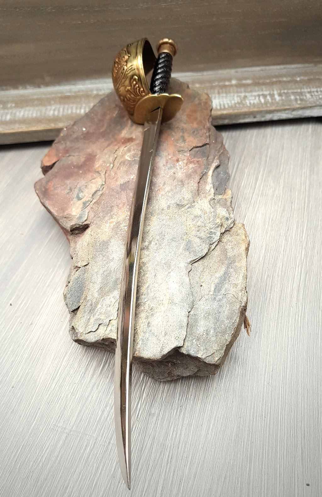Bronzefarbenes schöne Model eines Piratensäbels mit einem reich verzierten Handknauf zum Hineinfassen. Passt als lustige Deko auch zum Kostüm!