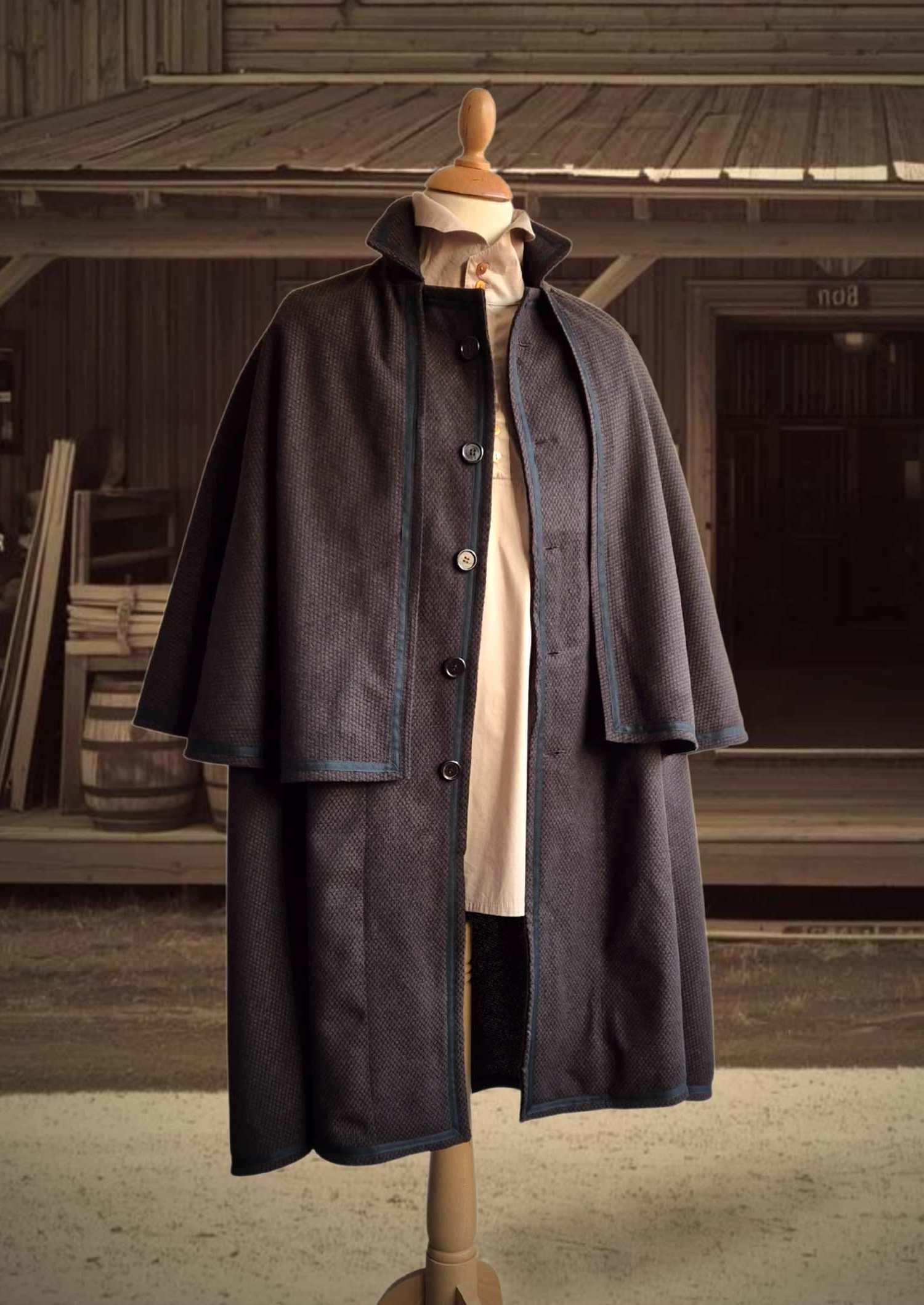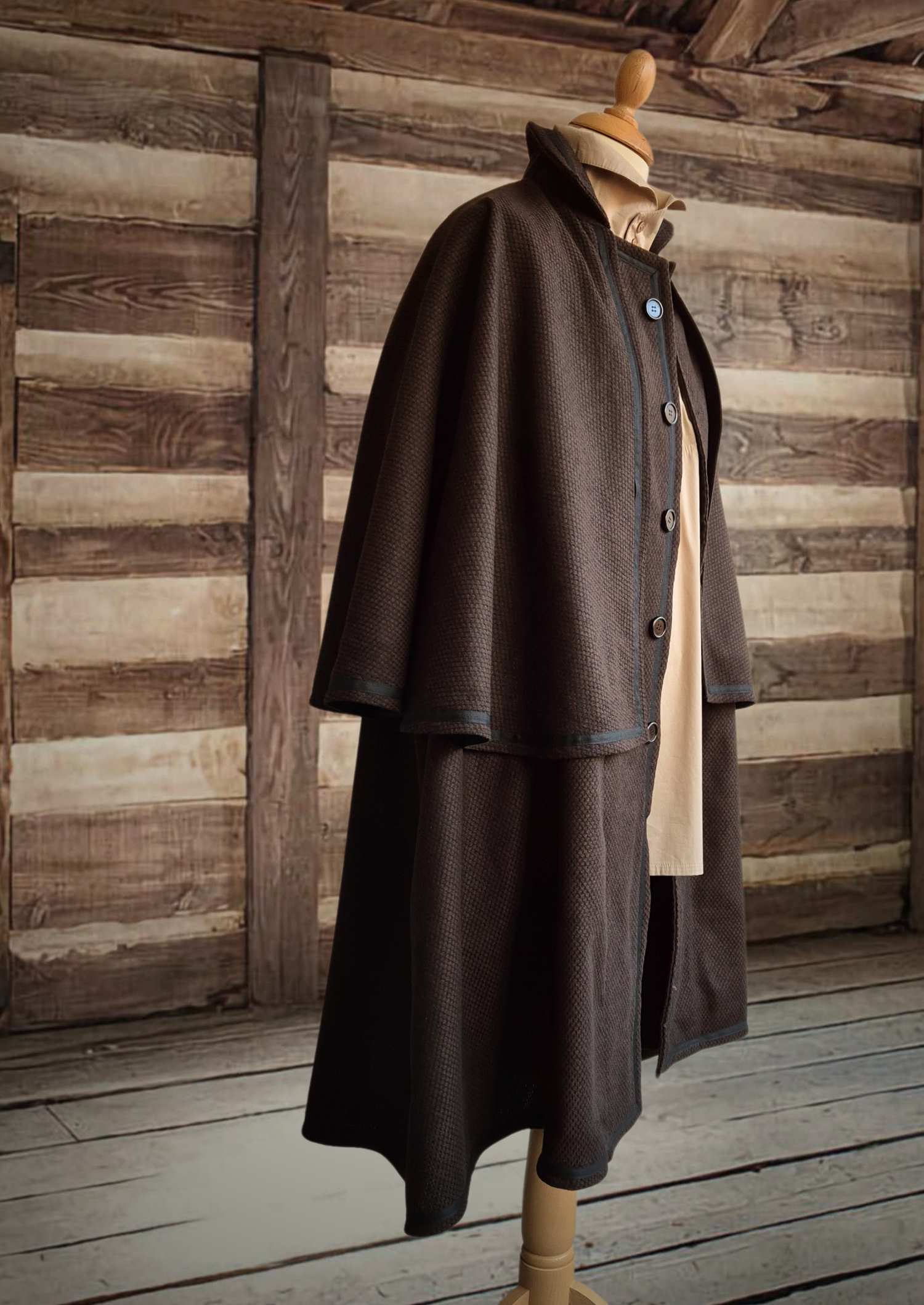 schweres Cape USA ca. 1850 zum Zuknöpfen aus hochwertigem Wollstoff in uni braun leicht meliert. Erinnert an viele aktuelle Westernserien