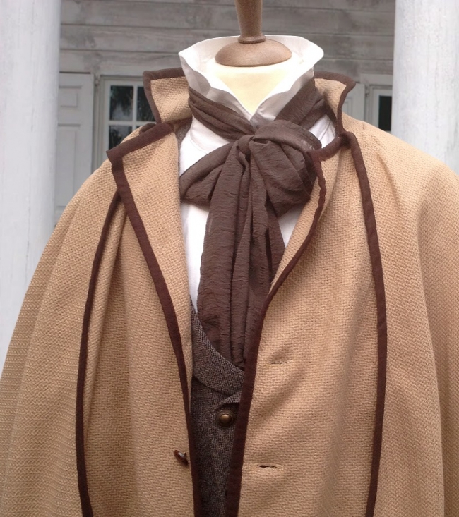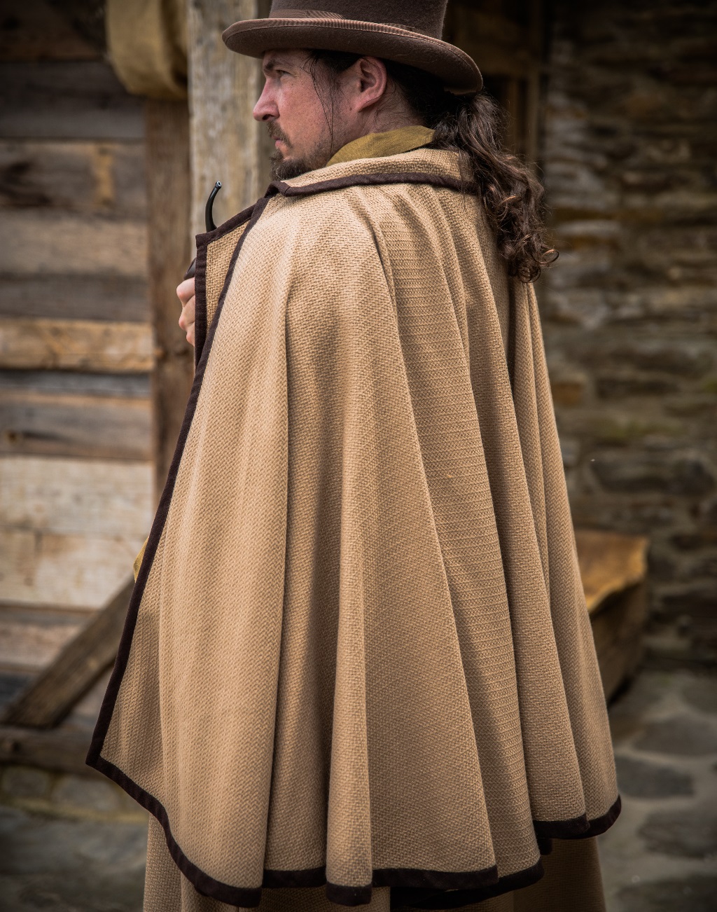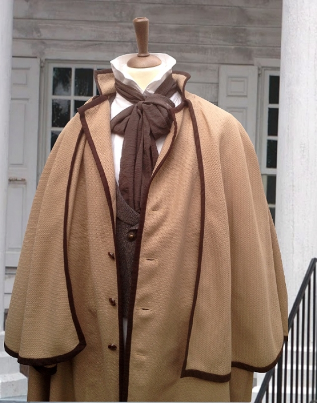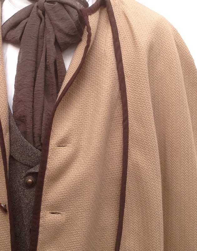 schweres Cape USA ca. Mitte 18.Jahrhundert zum Zuknöpfen aus Piqué Waffelmuster Stoff mit hohem Baumwollanteil. 2 Innenschlitze sorgen für ein komfortables Tragen des Capes