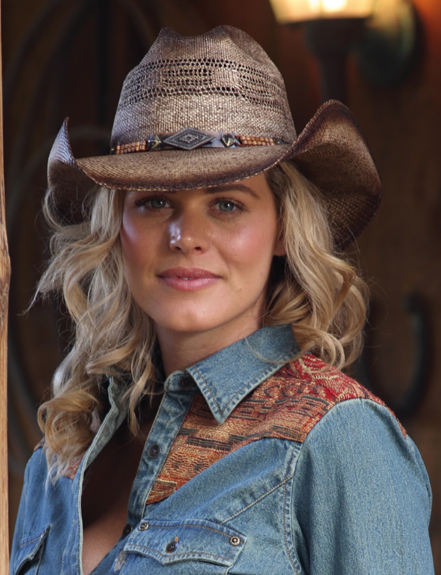 Unisex Cowboyhut mit nach oben gebogender Hutkrempe aus Stroh, welches im Vintagelook bearbeitet wurde, farblich genauso wie auf dem ersten Bild ausschaut. Durch sein leichtes Gewicht kann er auch locker längere Stunden getragen werden. Original aus den USA.