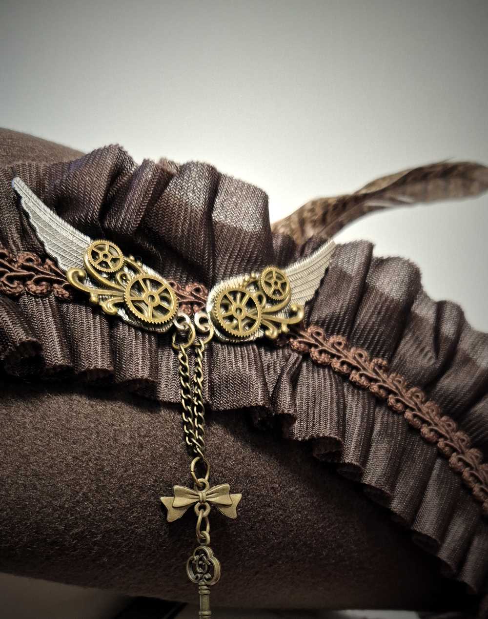 Reich verziert mit Faltenborte und Charmsanhängern die an Steampunk erinnern und Federn, macht er wirklich eine gute Figur....die Alternative für den schmalen Geldbeutel zu unseren selbstgemachten Wollfilz Hüten.