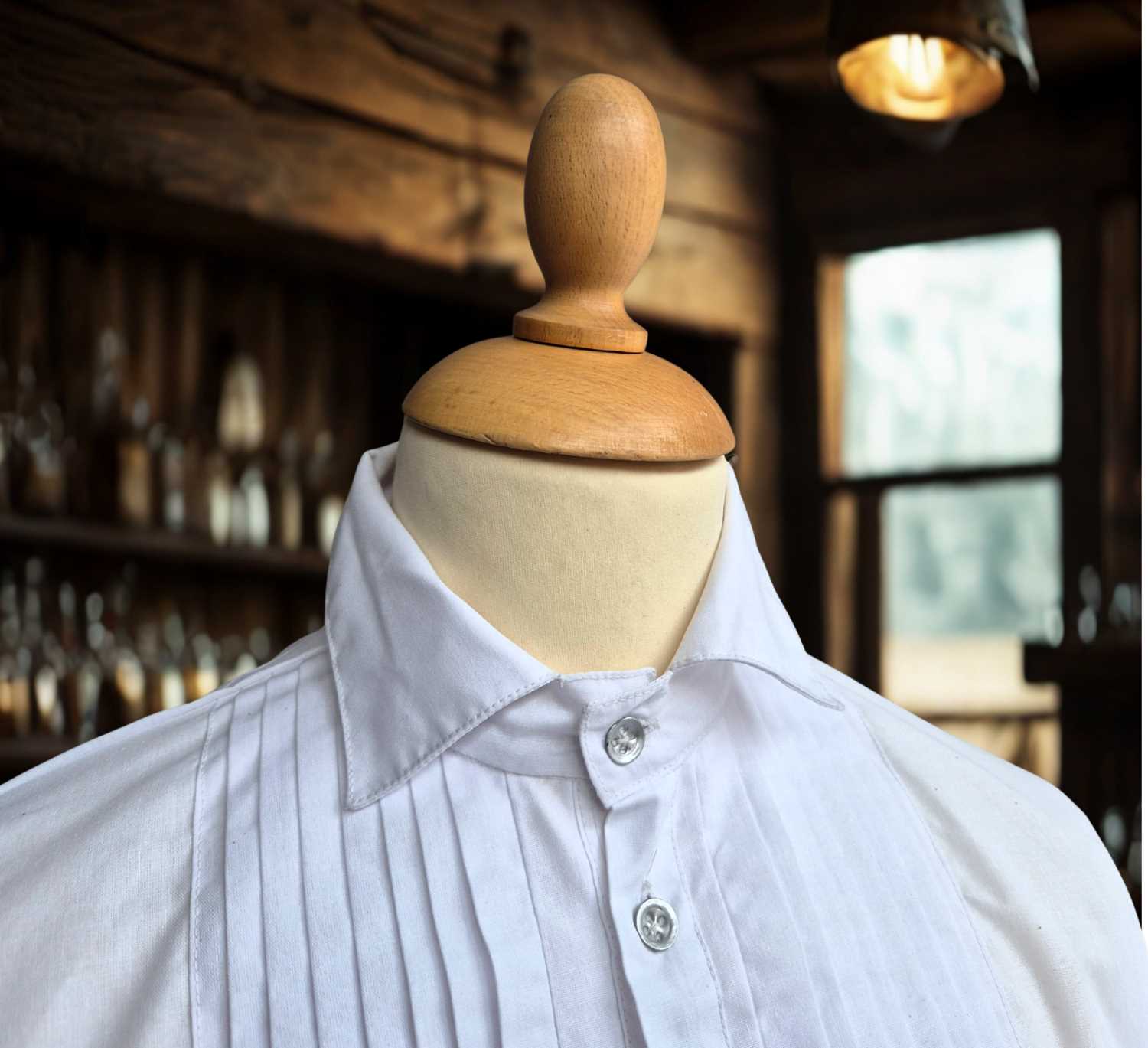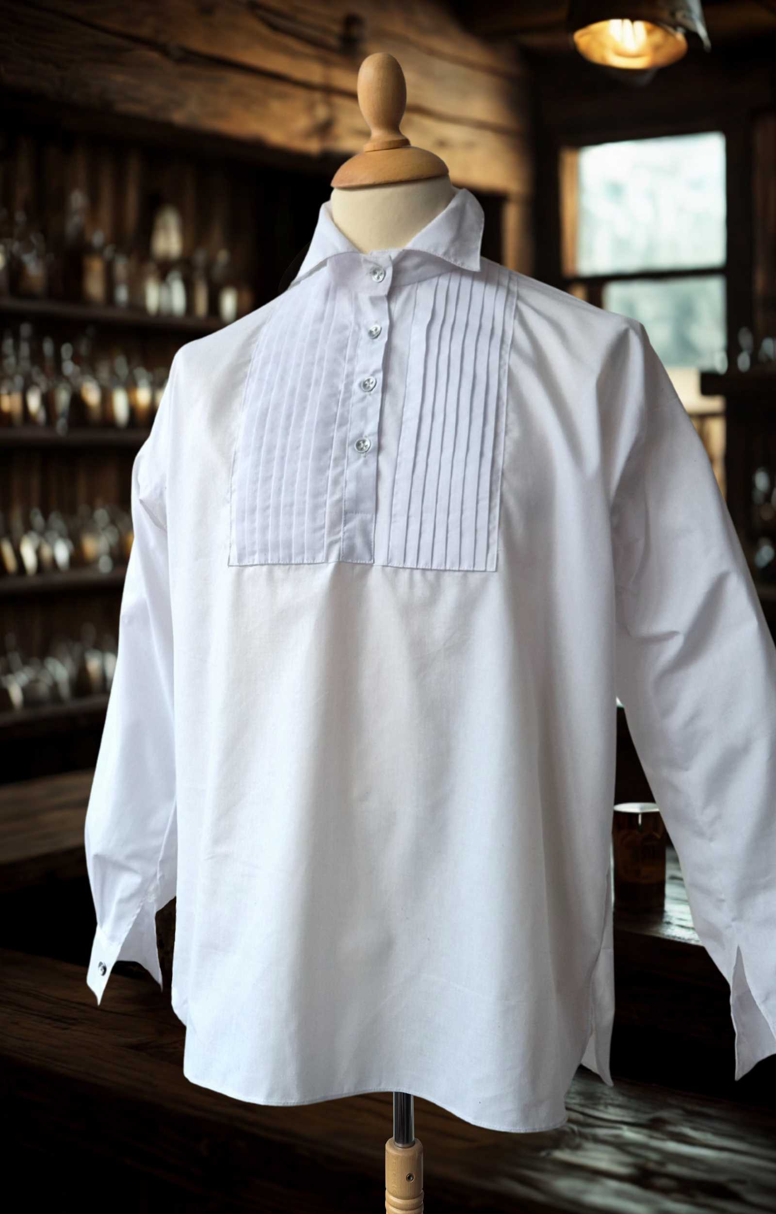 weißes Western Hemd, kann wechselweise schick oder als einfach geschnittenes Farmerhemd getragen werden. Passt zu allen Steampunk und wilder Westen Kostüme, mit normalem Kragen und halber Knopfleiste.