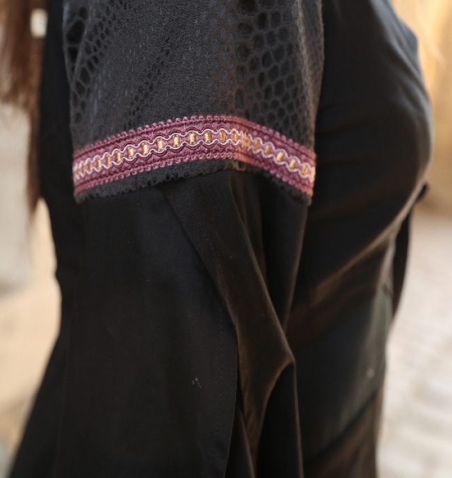 Hier wurden Baumwollstoffe, hochwertiges Waschleder beidseitig angerauht und eine Art SchlangenmusterJacquard verwendet. Mit einem altrosa Paspel abgesetzt, sieht es in den Farben schwarz-aubergine einfach umwerfend aus und nicht so trist!