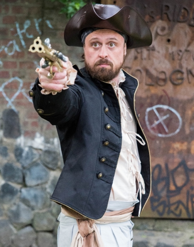 Modell im Uniformstil schwarz-gold, etwas kürzer geschnitten, mit echten Metallknöpfen. Authentischer Schnitt mit schrägen Schulternähten, fällt daher in der Schulter eher weiter aus und Ärmelmanschetten. Wunderbares Gewand nicht nur für Piraten! Acuh für die Bühne, dem Bandauftrit oder einfach zu Jeans absolut empfehlenswert