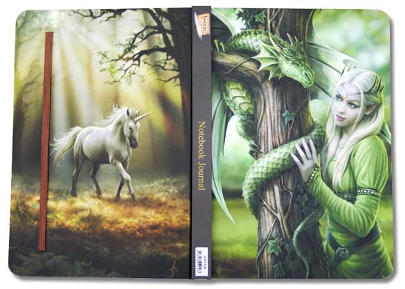 Der vordere Buchumschlag zeigt die Waldelfe oder Drachenkönigin, die Rückseite eine Einhorn. Das Buch hat leere Seiten innen