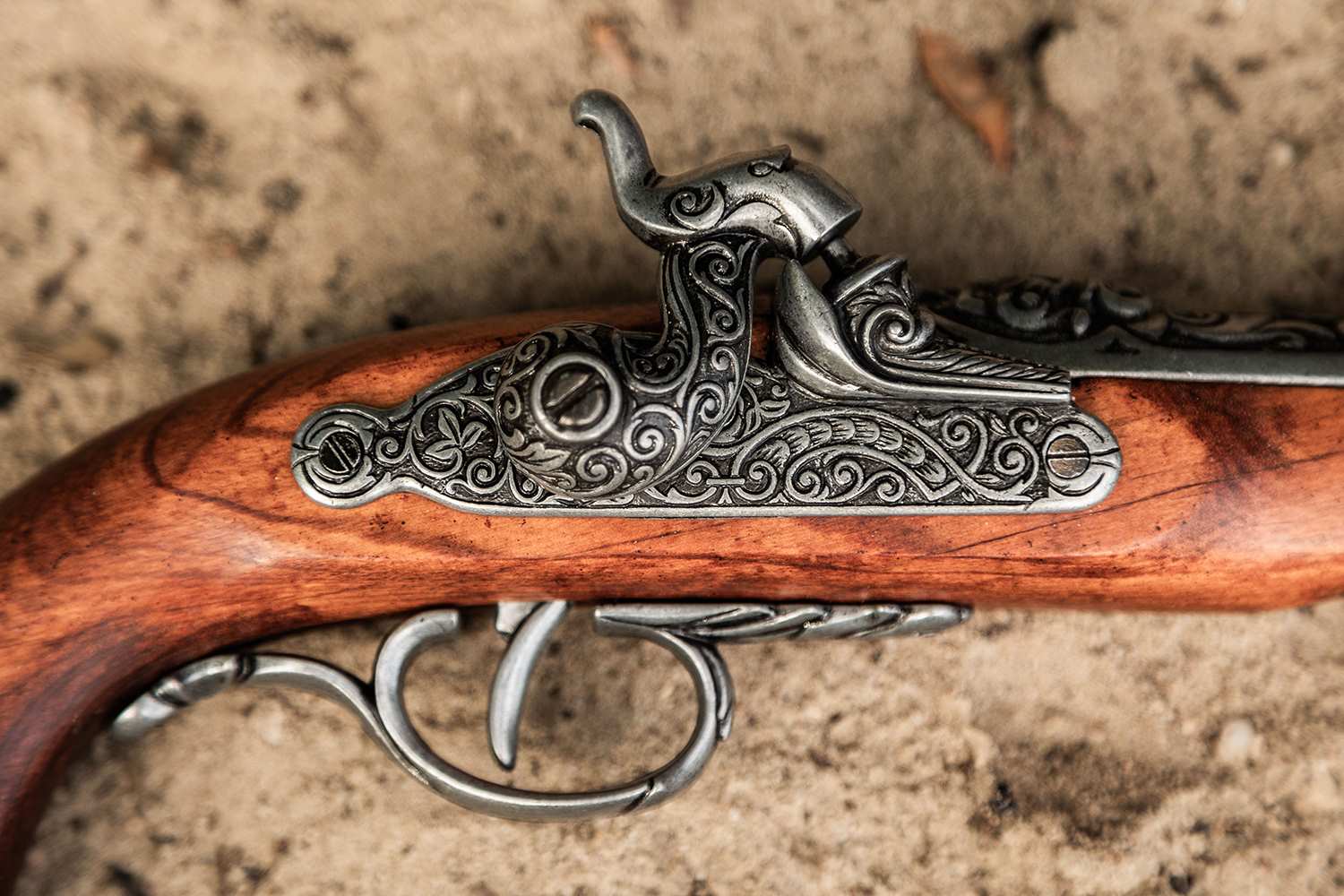 Piratenpistole Perkussions schuß graues Metall und Holzoptik mit Intarsien und ziemlich aufwändig hergestellt.
