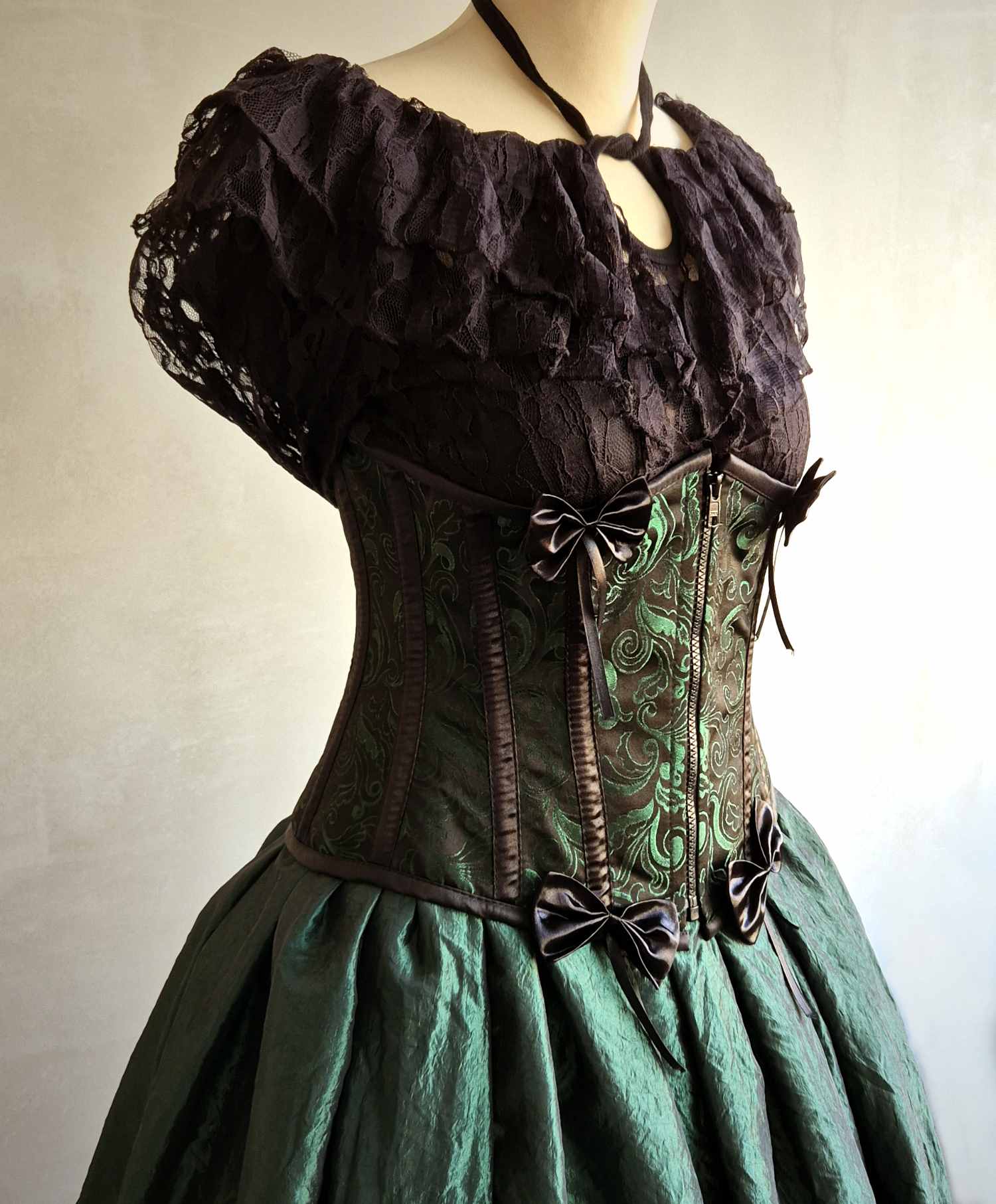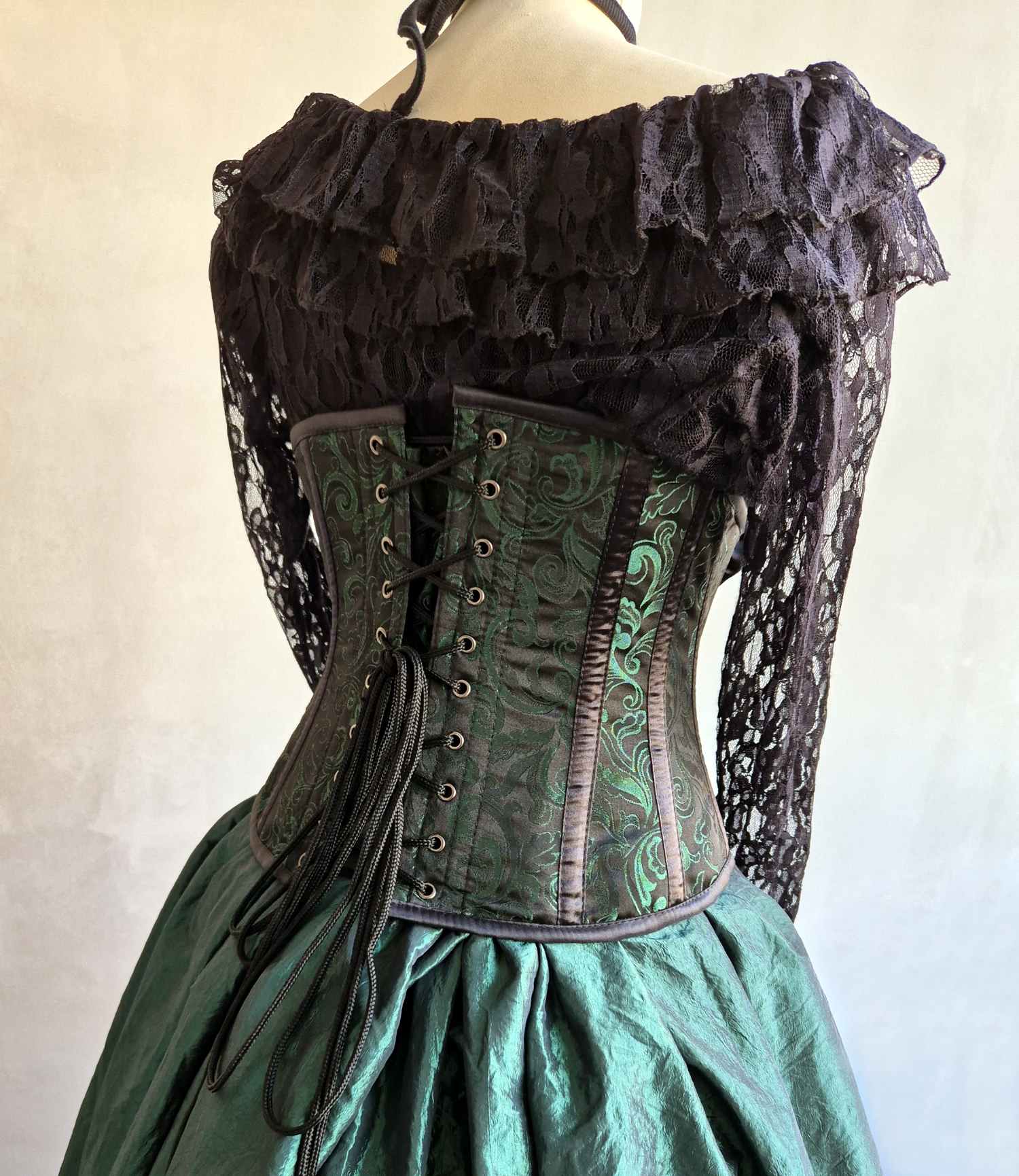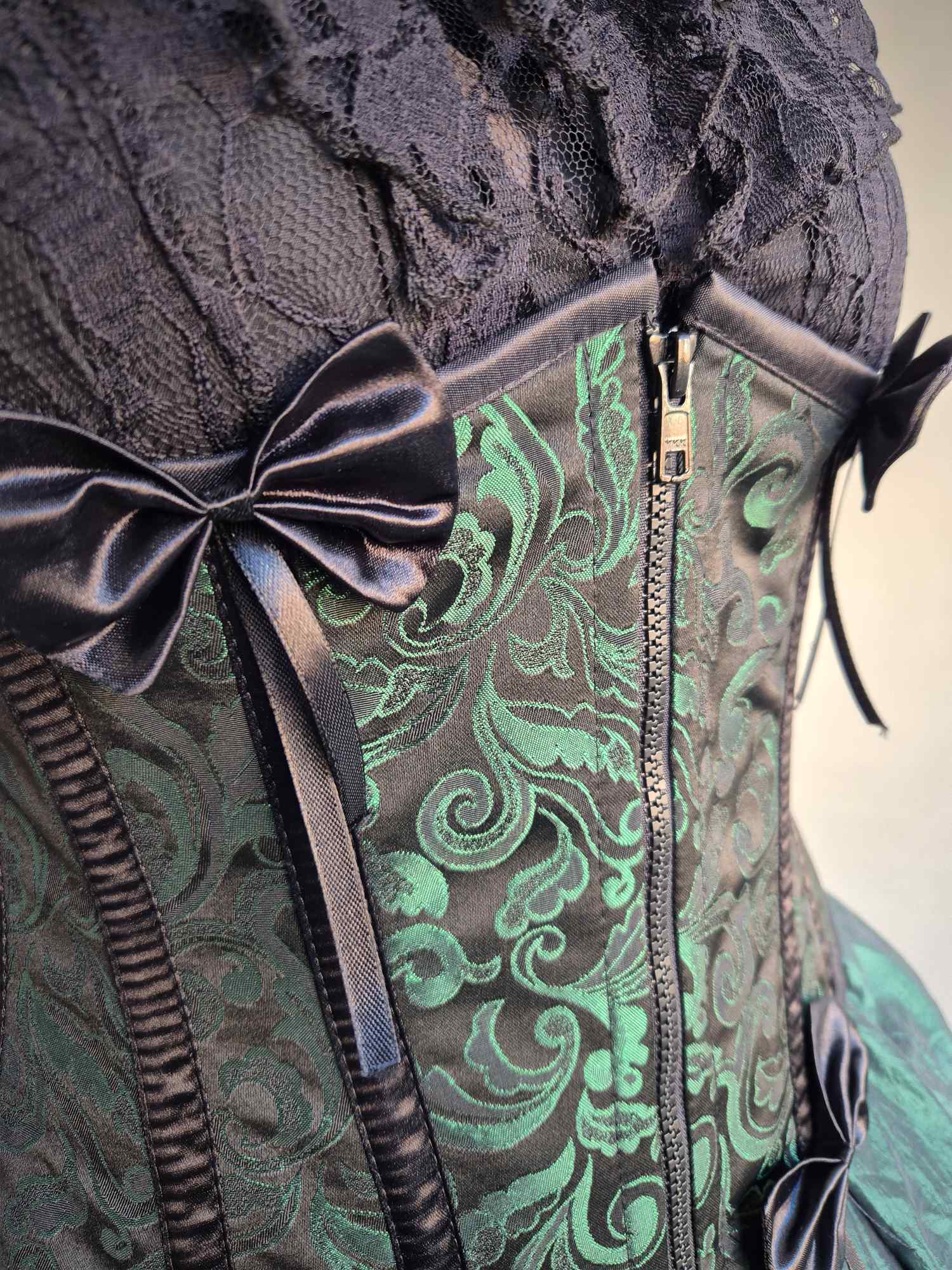 NEU!  Unterbrust Corsage in Jacquardstoff in grün-schwarz mit Reißverschluss vorne. Diese Corsage fällt normal aus, ähnlich wie die anderen Unterbrust Corsagen. Passt hervorragend zu den Civil War Röcken.