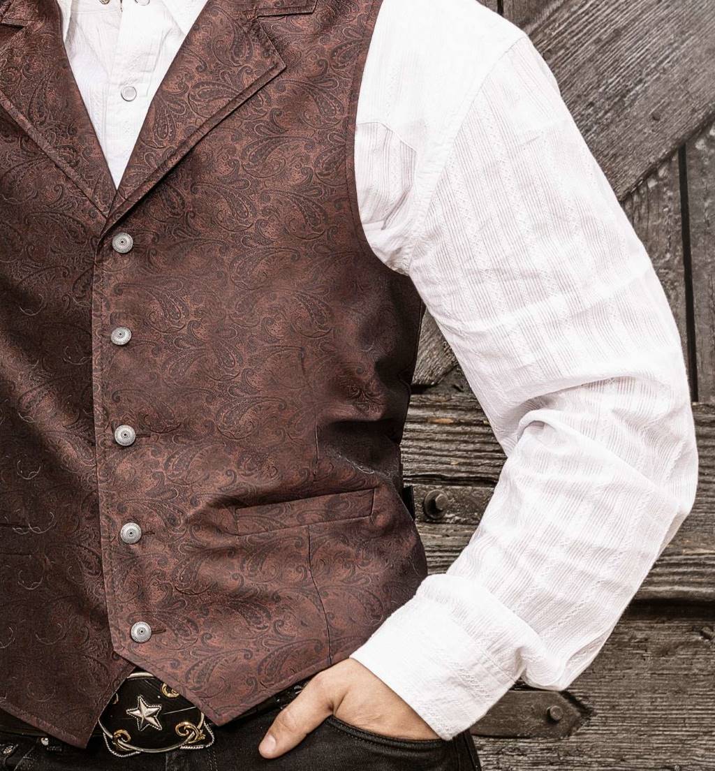 braune Jacquard Herren Weste einreihig. Hochwertige edle Knöpfe. Der kleine Schalkragen geht bis zur Schulternaht.