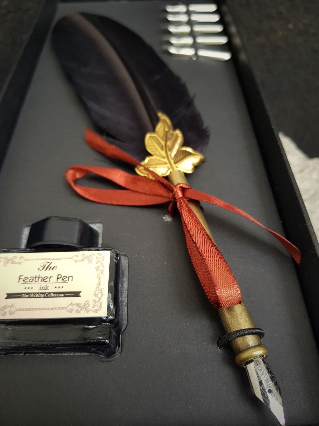 mittelalterliches Schreibset mit edler Schreibfeder vom Truthahn in schwarz. Der Kiel / Schaft wurde durch Griffe aus Zinn ersetzt, die ihr wählen könnt. 1 kleines edles Fäßchen mit 15 ml  schwarzer Tinte Tinte und 5 Schreibfedern in verschiedenen Größen ermöglichen euch ein schönes Schreiben auf Pergament oder normalem Papier. Geliefert wird der Artikel in einem stabilen Geschenkkarton. Länge: ca. 24 cm für alle Eure Pergamentrollen, Liebesbriefe, Rezepte uvm. Verfügbarkeit: 4-7  Tage Lieferzeit
