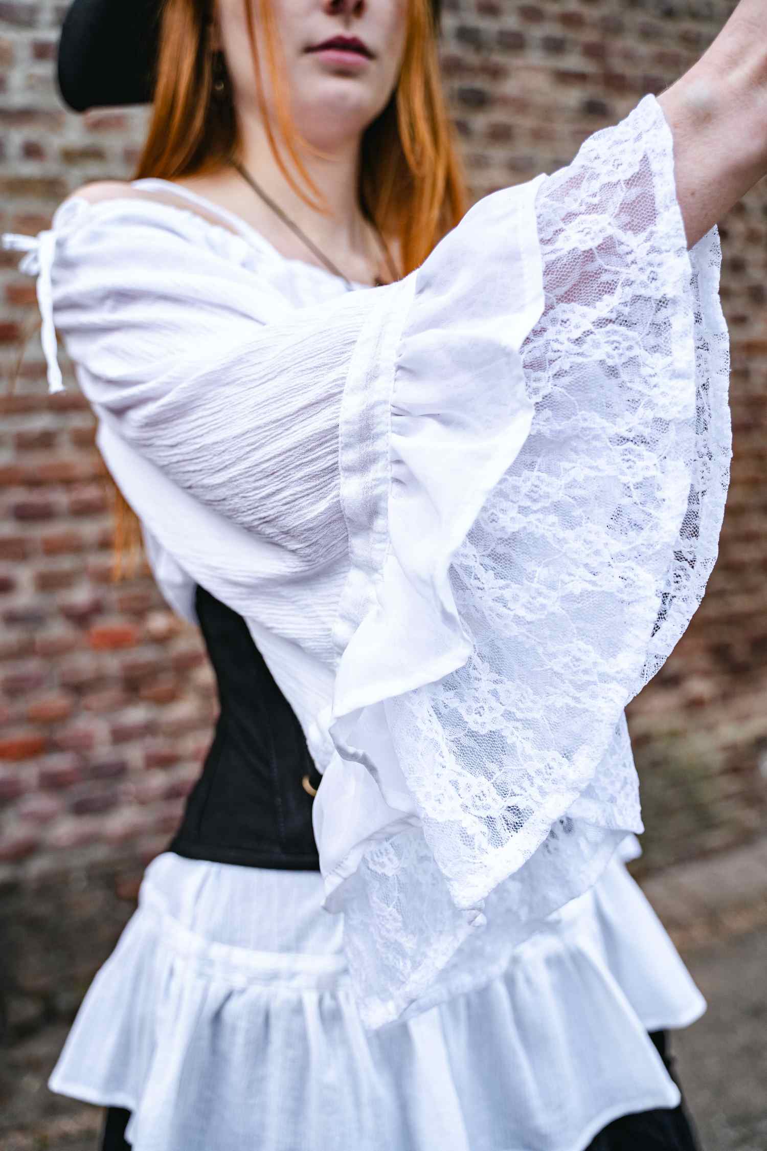 Alltagstaugliche tolle Steampunk oder Piratenbluse aus Crinkle Baumwolle. Die Bluse ist schulterfrei geschnitten, mit 2 dünnen Bändern und hat am oberen Ärmelteil zusätzlich Schnürungen. Mit reichlich Spitzen und Chiffon besetzt. Sieht super aus unter einem Mieder/Weste. Auch für eure Steampunk Kombinationen