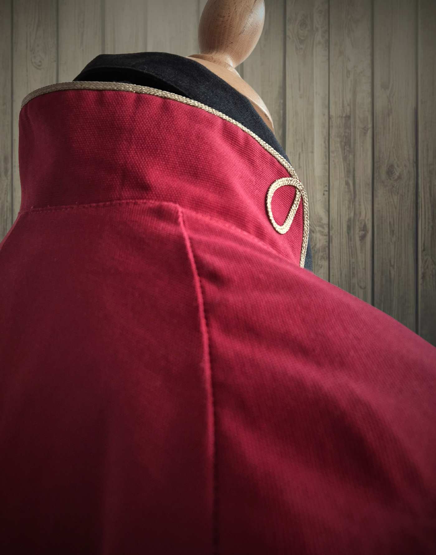 Farben: tiefes rot mit goldfarbener Bordüre. Die aufgesetzten Schlaufenteile sind bei dem schwarzen Mantel gold - schwarz abgesetzt wie auf dem Photo erkennbar ist. Vom Schnitt her identisch mit den anderen Uniformmänteln der Kostümtruhe.
