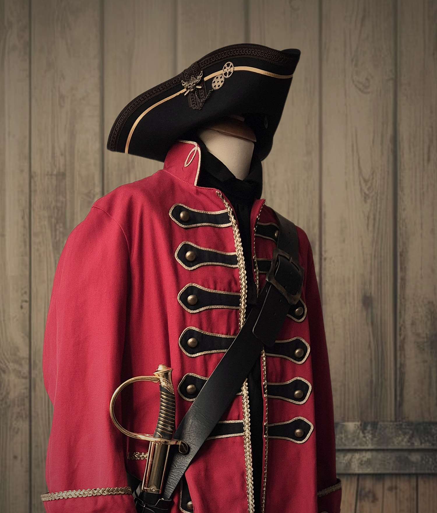 Hochwertiger roter Gehrock Piratenmantel aus unserer Reihe "Justeaucorps" aus dem 17-18 Jahrhundert aus reiner Baumwolle. Mit Innenfutter. Dieser Mantel besitzt noch edle 26  Metallknöpfe und eine hochwertige Borte, die ihr eventuell schon von dem schwarz-silbernen Uniformmantel her kennt.