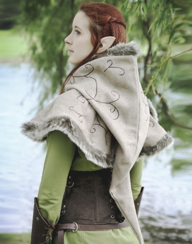 Cape aus Wolle mit schöner mittelalterlicher Schließe. Für Damen und Herren gleichermaßen geeignet. In vielen Farben lieferbar und passt nahezu immer. Liegt sehr gut auf der Schulter mit normaler Kapuze hinten. Lieferumfang: nur das Cape ohne abgebildetes Zubehör Material: 65% Wolle 35%PL mit Lederimitateinsatz  Größe: Standard ca. 131cm lang Farben: grau, schwarz, natur, braun, dunkles rot, grün (genau wie auf dem Photo, geht eher ins petrol) NEU: blau Verfügbarkeit: schwarz ist momentan nicht lieferbar beim Hersteller    7-14 Tage Lieferzeit.  Auf Anfrage gibt es dieses Cape auch mit langem Zipfel siehe letztes Bild